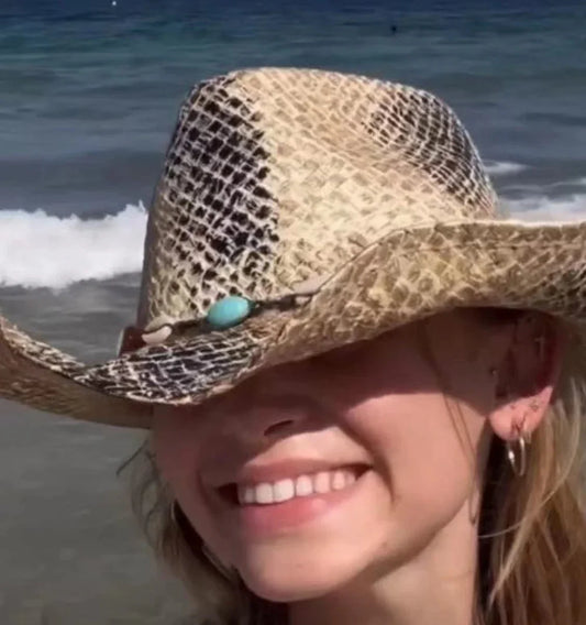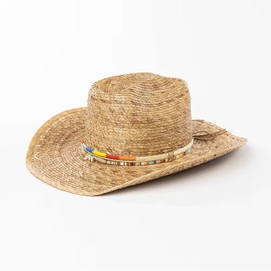 Turfing Colors Straw Cowboy Hat - Adjustable Straps & Beaded Band - Natural Grass Riffia Seagrass - 56-58cm Size - Unisex Outdoor Hat