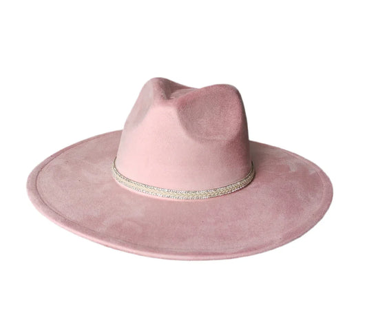 Wide Brim Fedora Hat - Vegan Suede Material, With Dazzling Accessory, Adjustable Straps, 10cm Brim, 12cm Height, Unisex Fashion Accessory
